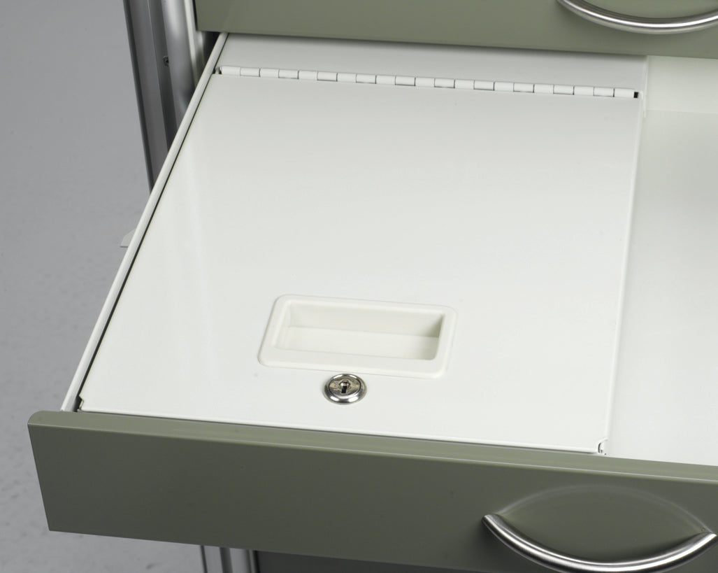 Lockable box for portable use or inside a 3"H drawer. Designed to fit two per drawer, or beside our AC-670S drug tray.