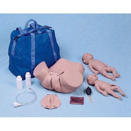 Anatomically correct pelvic model with premature and full term fetuses for practicing forceps and vacuum assist delivery. Includes simulated blood powder, an extra vulva, and a soft carrying bag. Pregnant belly overlay and transparent overlay can be added to this manikin.