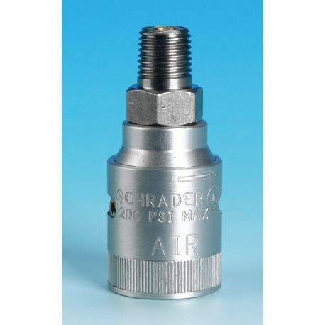 Schrader Medical twist-release gas connectors are safety-keyed for air. This quick connector safely handle up to 200 psi. Design prevents interchangeability of major internal parts for different gases. They are UL certified and comply to NFPA 99 (2002 edition).