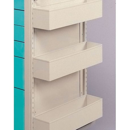 Three height-adjustable trays on rail system. Each tray measures 18 3/8"L x 4 1/2"D x 4"H.
